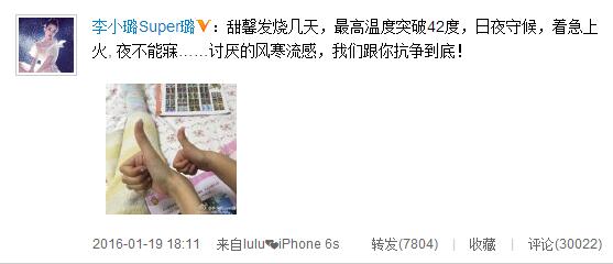 19日,李小璐在微博透露愛(ài)女生病,“甜馨發(fā)燒幾天,最高溫度突破42度,日夜守候,著(zhù)急上火,夜不能寐。討厭的風(fēng)寒流感,我們跟你抗爭到底”。同時(shí),也曬出母女倆攥緊拳頭以及伸出發(fā)拇指自我鼓勵的畫(huà)面。