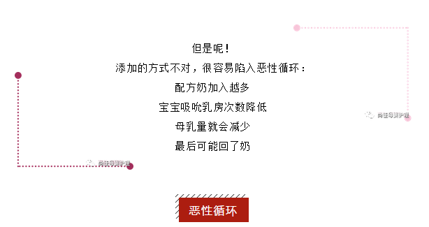 理性添加配方奶,不要一次性用配方奶喂飽寶寶,還是要先讓寶寶多吸吮乳房。惡性循環(huán)出現追根到底還是配方奶加的太多太頻繁。為什么會(huì )想添加配方奶?因為奶量不足夠滿(mǎn)足寶寶,那我們除了理性添加配方奶之外,還多一項任務(wù)“追奶!!!”