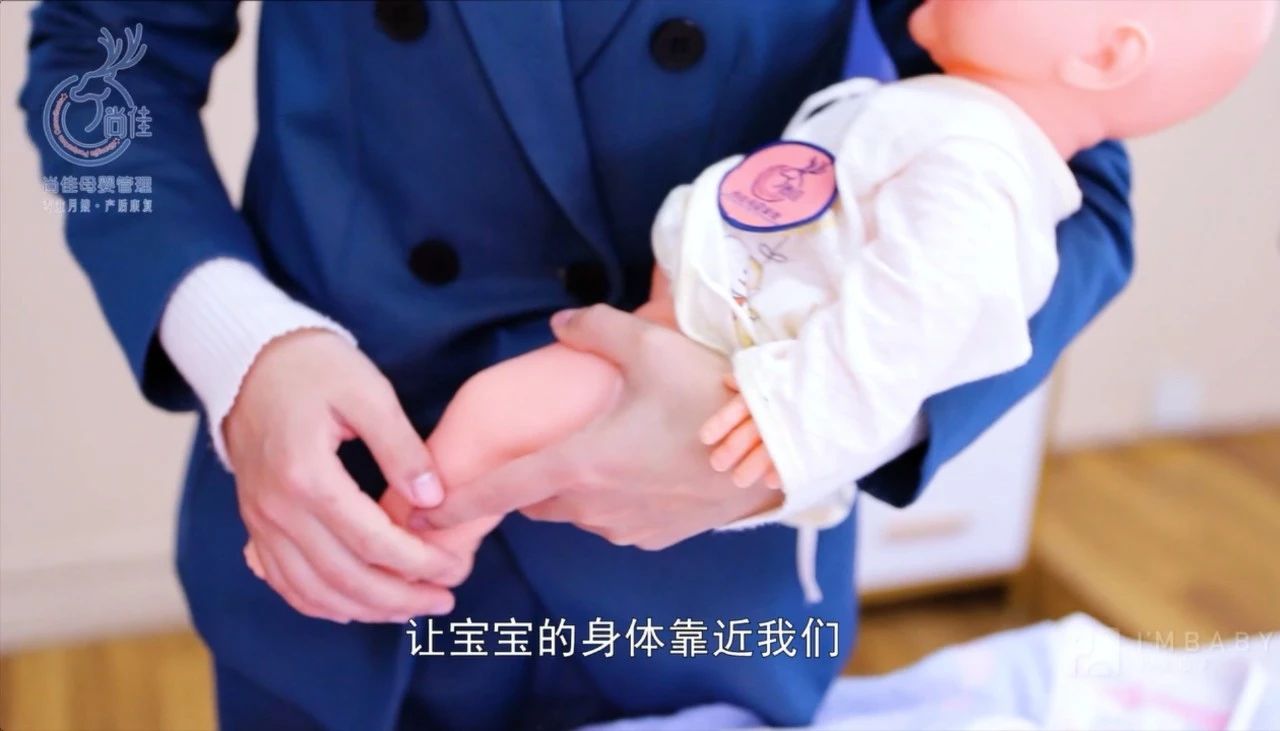 手要握住寶寶的大腿根部,讓寶寶的身體靠近我們,